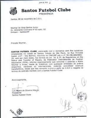 Com permissão do Santos, após a última renovação de contrato com o time alvinegro, o pai de Neymar, por meio da empresa NN Consultoria passou a negociar com clubes europeus pelo direito, segundo ele, de ‘free agent’ do jogador, que estaria sem contrato após a Copa do Mundo. Em novembro de 2011, jogador e Barcelona acertaram as transferência. Caso alguma parte desfizesse o negócio, haveria uma multa de 40 milhões de euros (cerca de R$ 140 milhões) .