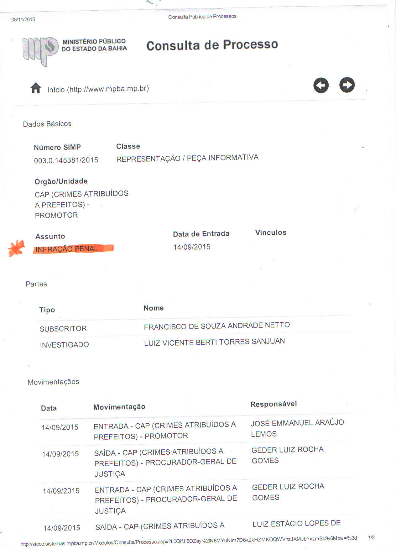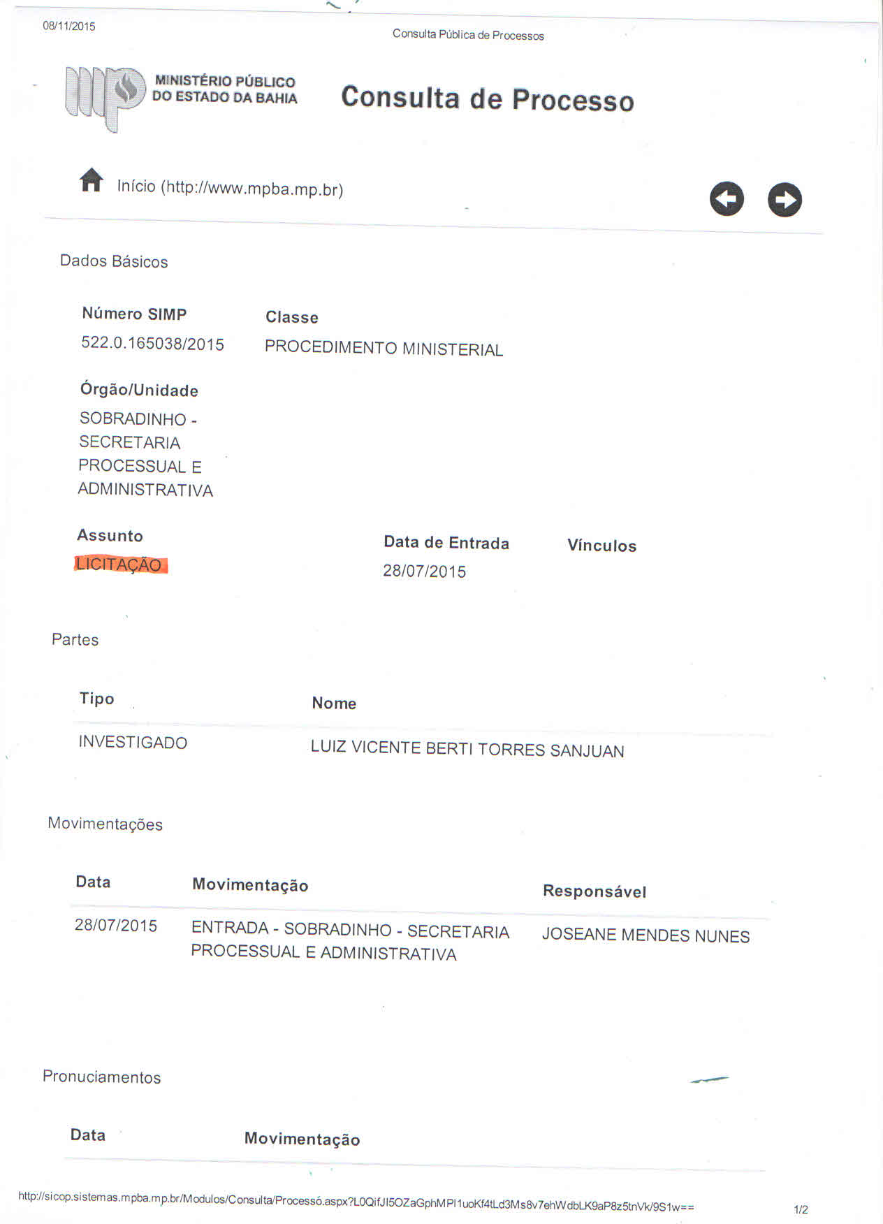 O Ministério Público Estadual da Bahia decidiu investigar duas denúncias contra o prefeito do município de Sobradinho, Luiz Vicente Berti (sem partido) na justiça. O primeiro está relacionado a uma Ação Civil com data de registro de entrada em 28/07/2015, que tem como base possíveis casos de irregularidades praticadas em licitações. A promotora  Joseane Mendes Nunes decidiu apurar o caso o que deixa o gestor municipal em situação nada confortável.
