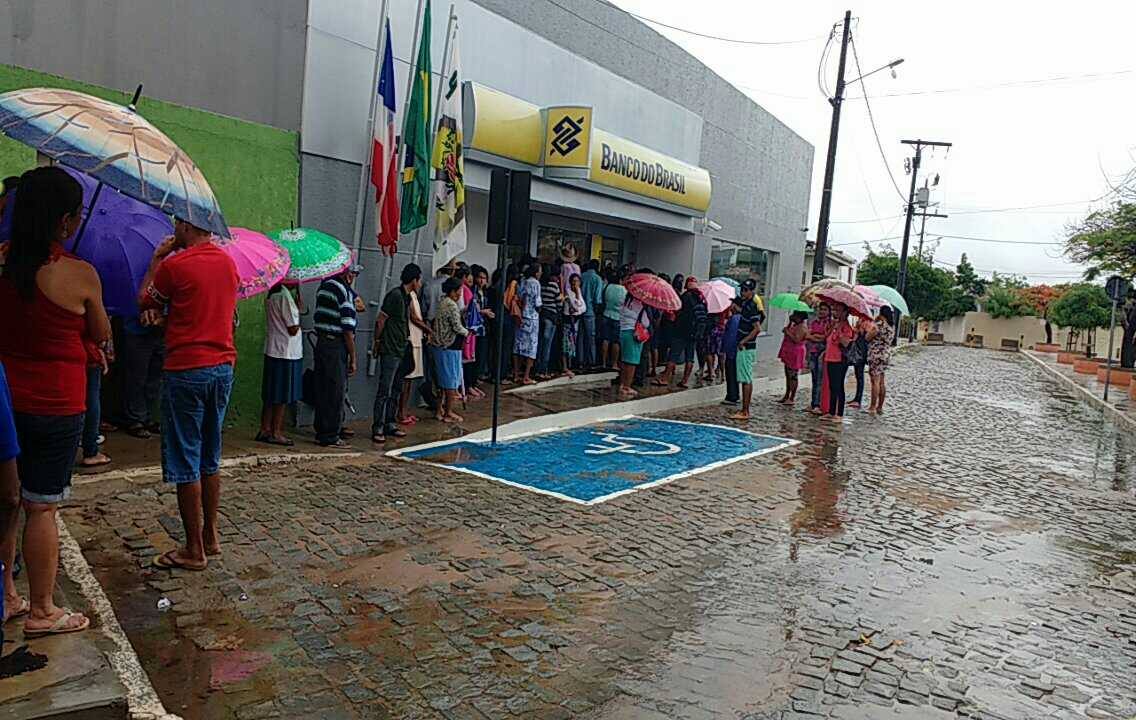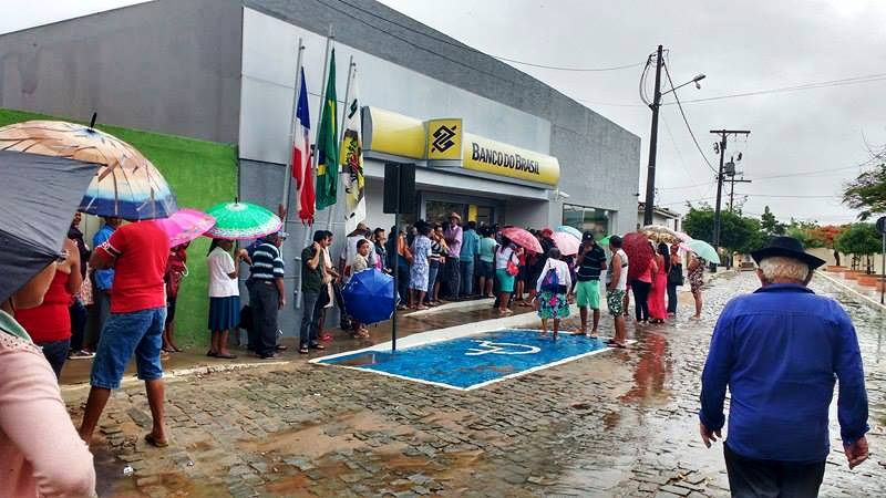 Debaixo de chuva, os clientes e usuários dos serviços do Banco do Brasil, aparentemente mais idosos, aguardam a abertura da porta do autoatendimento para poder adentrar na agência. Enquanto isso aguardam debaixo de chuva.