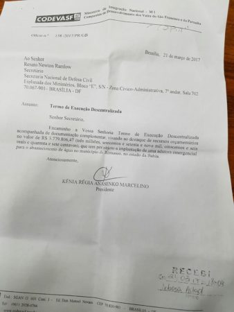 Na oportunidade foi viabilizado a liberação de recursos no valor de R$. 3.779.806,47(Três milhões setecentos e setenta e nove mil oitocentos e seis reais e quarenta e sete centavos), para a implantação de uma adutora emergencial para o abastecimento de água no município de Remanso.