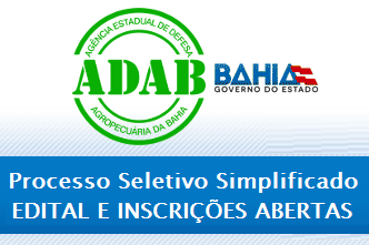A Agência Estadual de Defesa Agropecuária da Bahia (ADAB) anunciou a realização do processo seletivo simplificado, regido pelo edital n. º 01/2017, para contratação de 17 Auxiliares de Fiscalização, por tempo determinado, em Regime Especial de Direito Administrativo – REDA. As vagas são para os municípios de Remanso, Correntina, Encruzilhada, Ibotirama, Itamaraju, Luís Eduardo Magalhães, Mucuri, e Santa Rita de Cássia.
