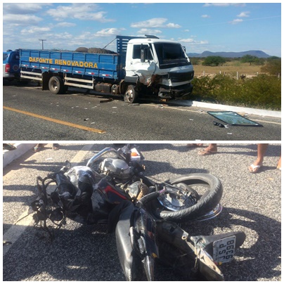 Segundo informações colhidas no local do acidente, o motociclista bateu de frente no caminhão , o mesmo veio a óbito no local do acidente, Com o impacto da colisão a vítima teve a cabeça arrancada.