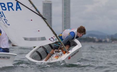 A configuração dos pequenos veleiros da classe optmist só permite atletas menores com idades entre os sete e 15 anos, desde que pesem no máximo 65 kg.