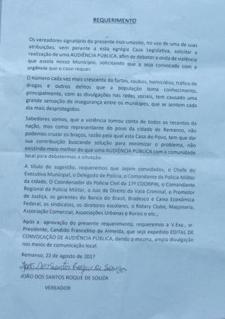 Diante dos constantes assaltos e com o crescimento iminente da violência em Remanso, levando a população a se manifestar frequentemente via rede social, exigindo das autoridades que adotem medidas urgentes para conter a criminalidade, os vereadores do (PCdoB), Didi, João do Pinga-Pinga e Humberto, na sessão de terça-feira (22/08), apresentaram um requerimento solicitando uma audiência pública, em caráter de urgência, com o objetivo de debater a violência que tanto assola o município.