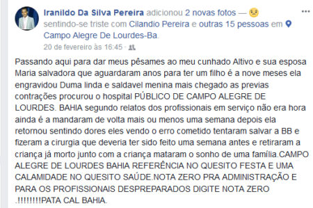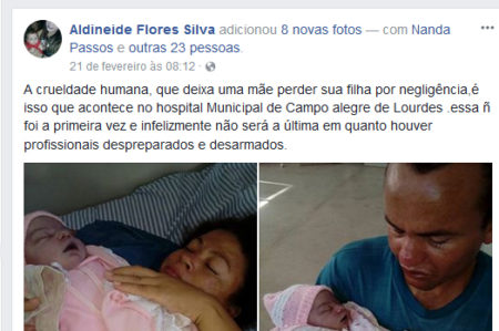 “A crueldade humana, que deixa uma mãe perder sua filha por negligência, é isso que acontece no hospital municipal de Campo alegre de Lourdes. Essa não foi a primeira vez e infelizmente não será a última, enquanto houver profissionais despreparados e desarmados”.