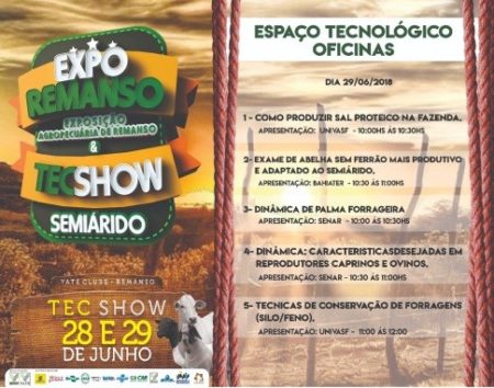 A Jornada Tecnológica – TECSHOW SEMIÁRIDO que será realizada nos dias 28 e 29 de junho durante a programação da Exposição Agropecuária de Remanso, acontecerá no Yate Clube a partir das 08:30h da manhã do dia 28/06. A jornada abordará 06 eixos temáticos: palma forrageira, caprinovinocultura, produção e conservação de forragens e leguminosas, apicultura, uso eficiente da água e bovinocultura de leite, onde serão apresentadas palestras, oficinas e dinâmicas pelas instituições parceiras  EMBRAPA, SENAR, SEBRAE, UNIVASF, UNEB, BAHIATER, BNB e empresas privadas. Que apresentarão diversas tecnologias apropriadas à produção no semiárido.
