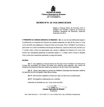 A Câmara de Remanso, aprovou em reuniões extraordinária realizada nos dias 05 e 12 de junho 2018, as contas do ex-prefeito Dr. Celso Silva e Souza, referentes ao ano de 2016.