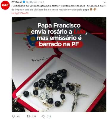 Já o PT, também em sua conta na rede social, escreveu: “Papa Francisco envia rosário a Lula, mas emissário é barrado na PF”. “Funcionário do Vaticano denuncia caráter ‘estritamente político’ de decisão da PF de impedir que ele visitasse Lula e desse recado enviado pelo papa”, tuitou o partido.