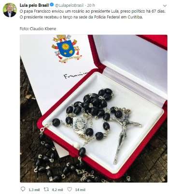 Na noite desta segunda-feira, o perfil do ex-presidente no Twitter havia publicado que “o papa Francisco enviou um rosário ao presidente Lula, preso político há 67 dias. O presidente recebeu o terço na sede da Polícia Federal em Curitiba”.