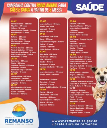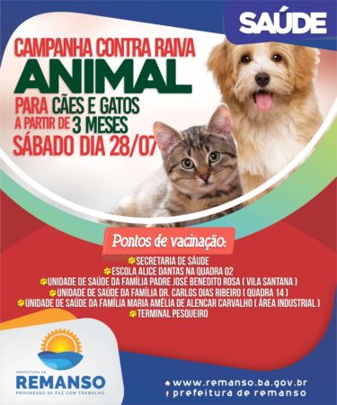 Já no dia D da Campanha Nacional de Vacinação Antirrábica, programado para sábado dia 28 de julho, a vacinação dos bichinhos de estimação será na área urbana de Remanso.