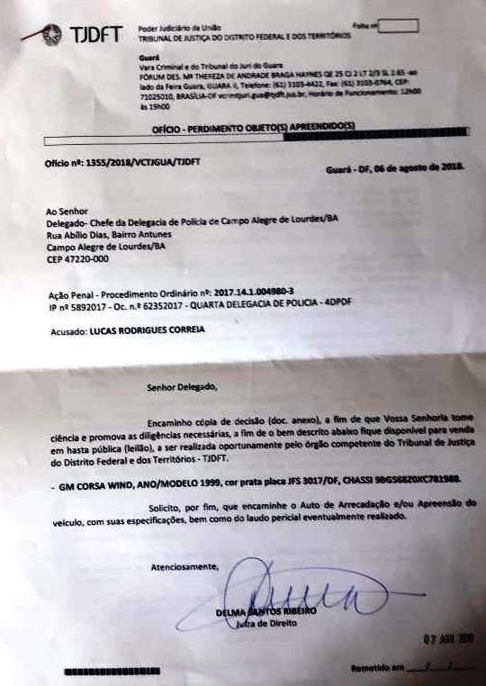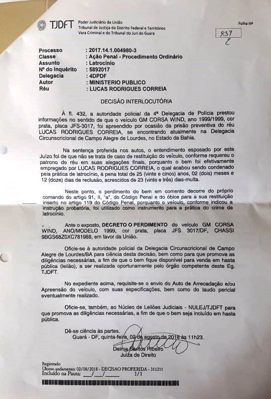 Naquele mesmo dia, os menores infratores repassaram o carro para um receptador da invasão da Santa Luzia, na Cidade Estrutural. Dias depois, o veículo foi encontrado abandonado na Rua 05, Quadra 05 da mesma cidade.