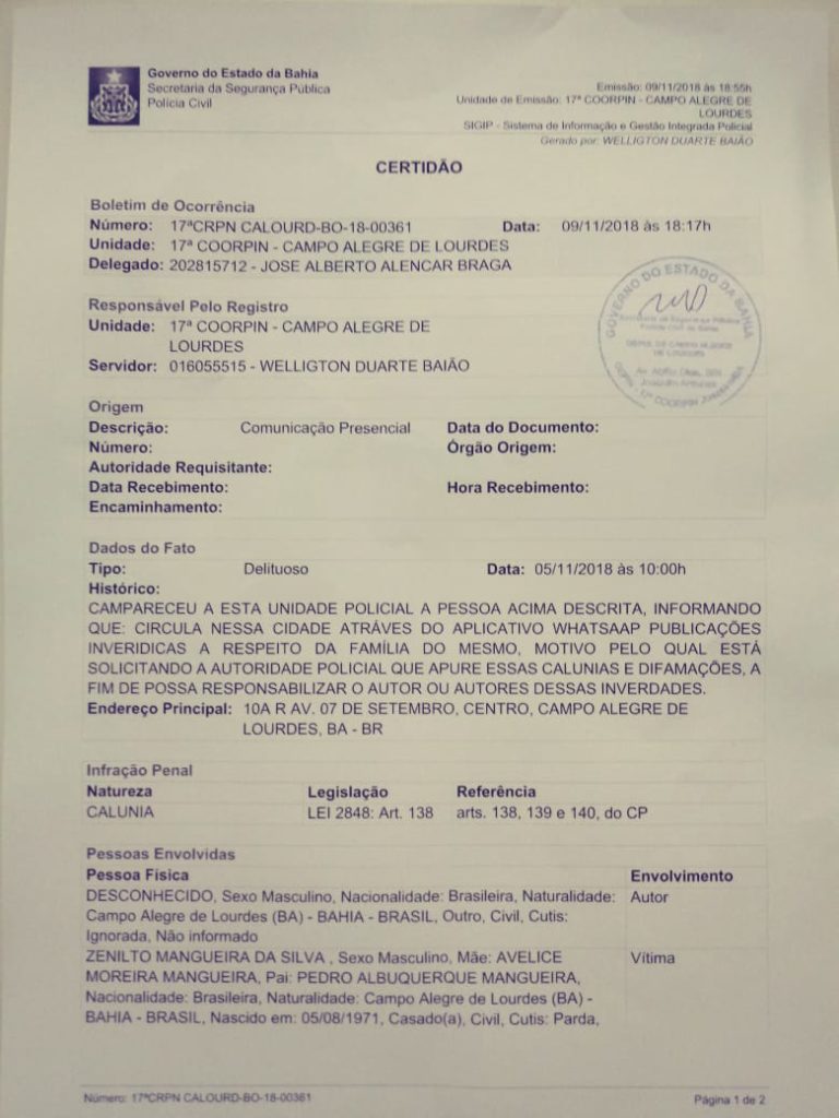 Nos últimos dias na cidade de Campo Alegre de Lourdes, uma notícia falsa (fake news) foi veiculada em mídias sociais principalmente no aplicativo WhatsApp, envolvendo o vereador Zenilton e sua família. O caso já está sendo investigado pela (17º) Coorpin da Delegacia de Polícia Civil de Campo Alegre de Lourdes.