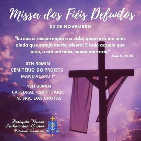 Fieis católicos vão celebrar o Dia de Finados nesta sexta-feira (02). Em Juazeiro, às 7h30 uma missa será celebrada no Cemitério do Projeto Mandacaru. Á noite, 19h30 os fies participam da Missa na Igreja Catedral.