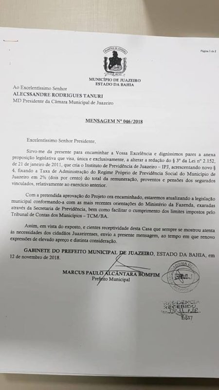 O projeto de lei que foi encaminhado pelo executivo para a Câmara de Vereadores de Juazeiro que prevê o desconto de 2% do total da remuneração, proventos e pensões dos segurados, servidores municipais, para a manutenção do Instituto de Previdência dos Servidores de Juazeiro (IPJ).