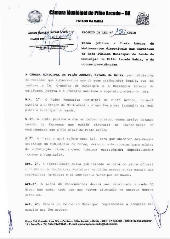 De acordo com o texto do projeto, a prefeitura municipal de Pilão Arcado por meio de seu órgão responsável, Secretaria de Saúde do município ficará obrigado a divulgar a listagem dos medicamentos disponíveis na rede pública de saúde do município, como também atualizar a mesma a cada 30 dias.
