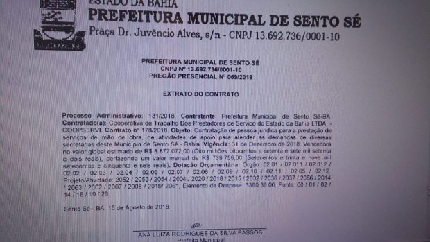As coisas parecem que andam desarrumadas na prefeitura do município de Sento Sé que tem como gestora a senhora Ana Passos (PSD). De acordo informações enviados pelo blogueiro Osiel Amaral para a redação do AP, a prefeitura formalizou contrato com a Cooperativa de Trabalho dos Prestadores de Serviço do Estado da Bahia LTDA – Coopservi, no valor de R$ 8.877.072,00 antes que um Projeto de Lei tramitasse na Câmara de Vereadores para avaliar e ao mesmo tempo dar o aval ou não.