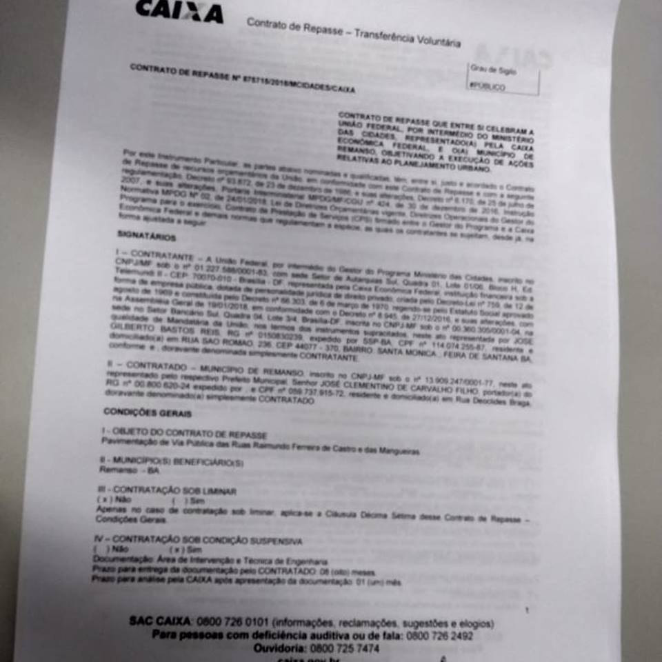 O prefeito de Remanso, José Clementino de Carvalho Filho (PSD) assinou na manhã desta segunda-feira (05) de novembro na cidade de feira de Santana, o contrato junto a Caixa Econômica Federal, para a pavimentação das seguintes ruas, rua das Mangueiras no bairro Aírton Senna, e rua Raimundo Ferreira de Castro no bairro Vila Santana.
