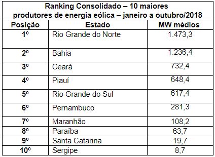 Quando a análise foca na geração por estado, o Rio Grande do Norte se mantém como maior produtor de energia eólica no país com 1.473,3 MW médios de energia entregues nos primeiros dez meses de 2018. Na sequência, aparecem a Bahia com 1.236,4 MW médios produzidos, o Ceará com 732,4 MW médios, o Piauí com 648,4 MW médios, e o Rio Grande do Sul com 617,4 MW médios.