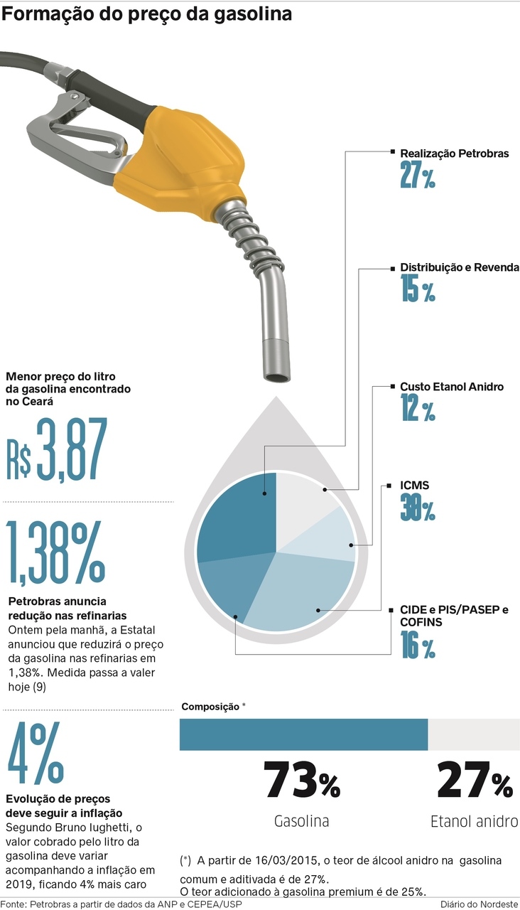 As três últimas reduções do preço da gasolina nas refinarias brasileiras já podem ser sentidas nos postos de combustíveis do Ceará. De acordo com levantamento da Agência Nacional do Petróleo, Gás Natural e Biocombustíveis (ANP), o valor do litro do produto caiu 3,28% em quatro semanas no Estado. Apesar das baixas, a tendência é de estabilização dos preços, impactando consequentemente nas bombas. Para 2019, a expectativa segue o fechamento da inflação anual, estimada em cerca de 4% pelo Boletim Focus do Banco Central.
