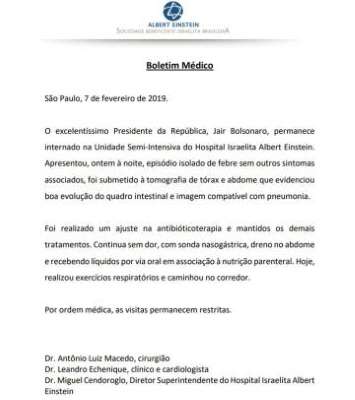 Os médicos que cuidam do presidente Jair Bolsonaro (PSL), internado há 11 dias no hospital Albert Einstein, em São Paulo, detectaram em tomografia de tórax e abdome uma “imagem compatível com pneumonia”, segundo boletim médico divulgado nesta quinta-feira. O presidente, que se recupera de uma cirurgia para reconectar o intestino após o atentado a faca que sofreu, também teve febre na noite de quarta-feira e já vinha tomando antibióticos, que agora serão substituídos. “Estamos muito tranquilos, bem e seguimos firmes”, escreveu Bolsonaro em seu perfil no Twitter nesta quinta.