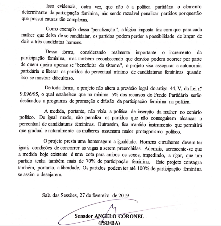 Para o pessedista, a regra em vigor estimula candidaturas laranjas. O senador justificou que “o projeto visa assegurar a autonomia partidária e liberar os partidos do percentual mínimo de candidaturas femininas”. A proposta, no entanto, “não altera o artigo 44, da lei nº 9.096/95, o qual estabelece que no mínimo 5% dos recursos do Fundo Partidário serão destinados a programas de promoção e difusão da participação feminina na política”.