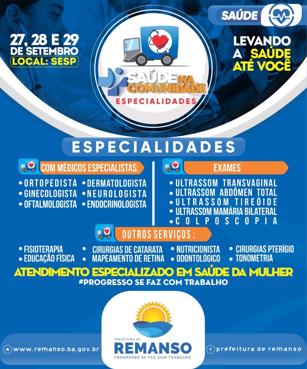 A prefeitura de Remanso através da secretaria municipal de saúde, realizara nos dias 27, 28 e 29 de setembro, mais uma Ação da saúde na comunidade- Especialidades.