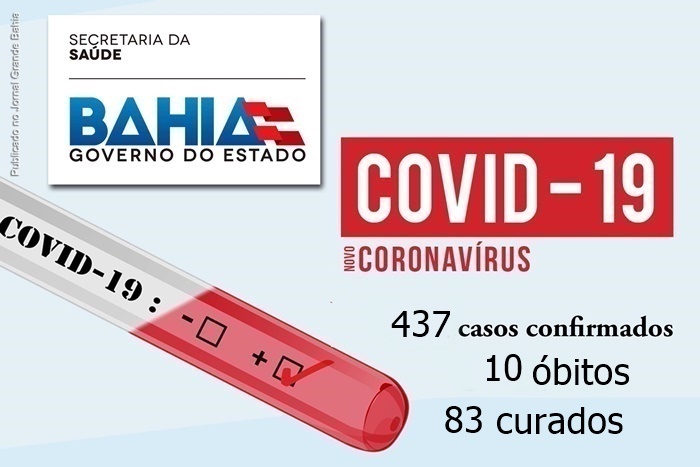 Bahia registra 437 casos confirmados do novo coronavírus (Covid-19), o que representa 6,7% do total de casos notificados. Até o momento, 2.511 casos foram descartados e houve dez óbitos, sendo 08 no município de Salvador (05 idosos do sexo masculino, 01 idosa do sexo feminino, 01 pessoa do sexo masculino de 55 anos e 01 pessoa de 41 anos do sexo feminino), 01 óbito no município de Utinga (sexo masculino, 80 anos) e 01 no município de Itapetinga (sexo feminino, 28 anos).