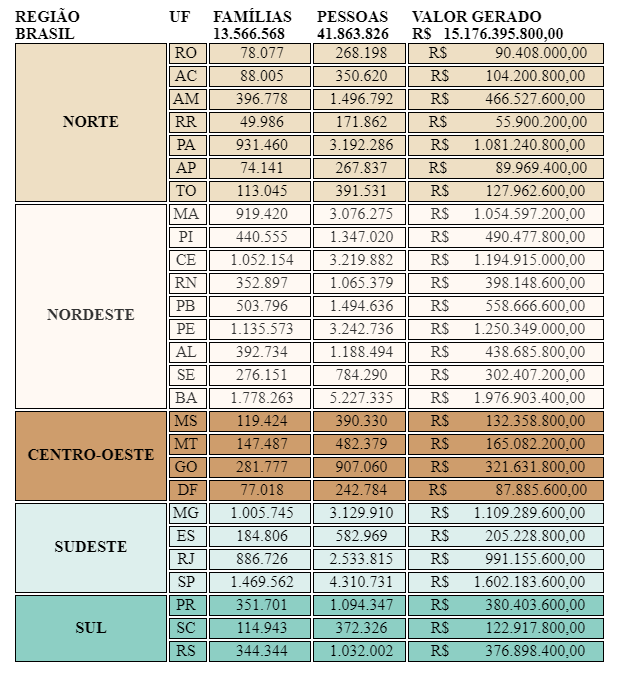 A Região Nordeste aparece com destaque nos repasses do Auxílio Emergencial a integrantes do Bolsa Família em abril de 2020. Quatro estados da região vão receber mais de R$ 1 bilhão. São os casos de Bahia, Ceará, Maranhão e Pernambuco. A Bahia, aliás, é a Unidade da Federação que receberá o auxílio emergencial para o maior número de famílias do programa neste mês. São quase 1,8 milhão de famílias, totalizando mais de 5,2 milhões de pessoas, em um aporte de quase R$ 2 bilhões. Em seguida aparece o estado de São Paulo, com 1,4 milhão de famílias, beneficiando mais de 4,3 milhões de pessoas, e um investimento de R$ 1,6 bilhão.