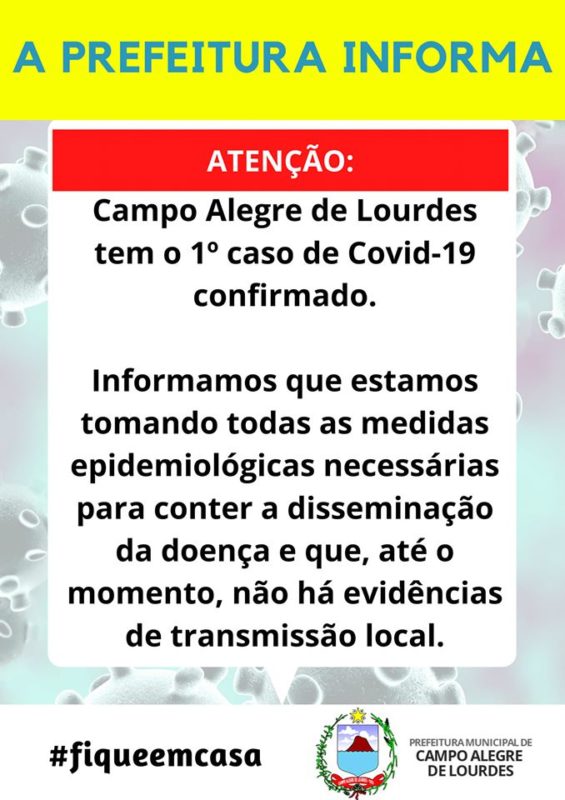 A cidade de Campo Alegre de Lourdes registrou, na noite desta quarta-feira, 22, o primeiro caso confirmado de Covid-19 no município, informou a Prefeitura, por meio da secretaria municipal de Saúde.  De acordo com informações o paciente é um homem de 53 anos, que já se encontra em isolamento hospitalar e passa bem.