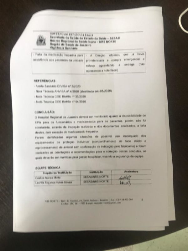 Na reunião, tensa, entre vereadores e Diretoria do Hospital, foi apresentado um relatório da Vigilância Sanitária da última segunda-feira que dá veracidade às denúncias. A conclusão da inspeção da Vigilância, entre outras coisas, diz: O Hospital Regional de Juazeiro deverá ser monitorado quanto a disponibilidade de EPIs para os funcionários e medicamentos para os pacientes”.
