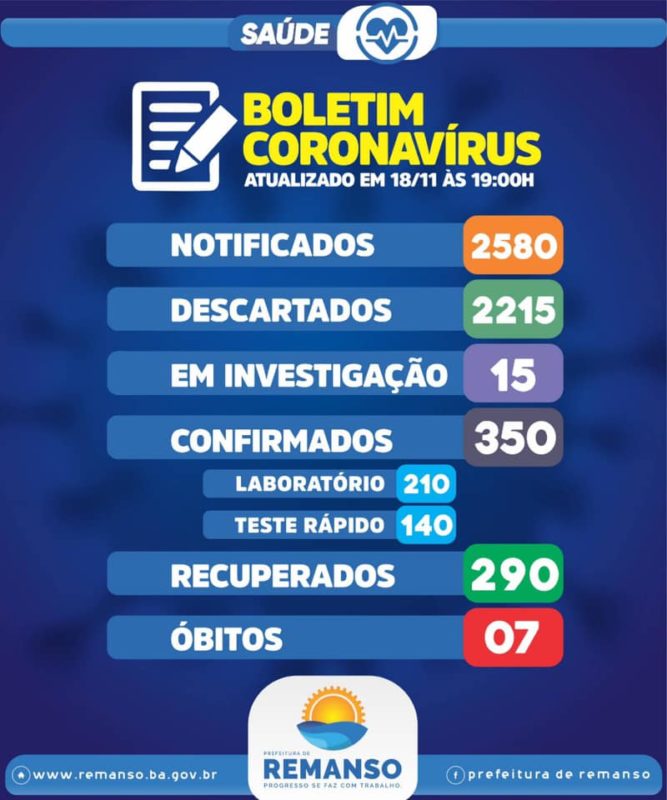 Destaque RemansoSobe para 53 casos confirmados de Coronavirus ativos em Remanso por Redação Remanso News19 de novembro de 202019 de novembro de 20200436 De acordo com o Boletim Epidemiológico divulgado pela secretaria municipal de Saúde na noite desta quarta-feira (18), o numero de casos de Corona vírus voltou a subir no município. Confira o Boletim: