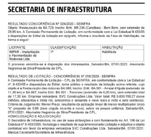 O Diário Oficial da Bahia, publicou na sexta-feira, 08/01 a homologação do resultado da Concorrência Pública 024/2020, destinada a definir a empresa encarregada da “Restauração da BA.723, trecho: entre BR.235 (Caraíbas) – Bem Bom, com extensão de 23,85 km”.