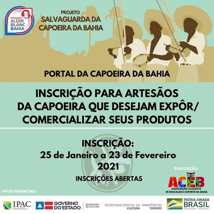 O objetivo é ajudar no escoamento e comercialização direta de produtos feitos por mestres (as) artesãos(ãs) previamente selecionados, com o intuito de fomentar a produção de produtos, principalmente da velha guarda da Capoeira, a fim de impactar positivamente na renda dos capoeiristas. Interessados em fazer parte desta iniciativa devem solicitar sua inscrição até o dia 23 de fevereiro.