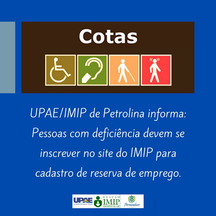 A Unidade de Pronto Atendimento e Atenção Especializada de Petrolina (UPAE/IMIP) informa que pessoas com deficiência devem realizar inscrição no site do IMIP para cadastro de reserva para emprego, através do link:
