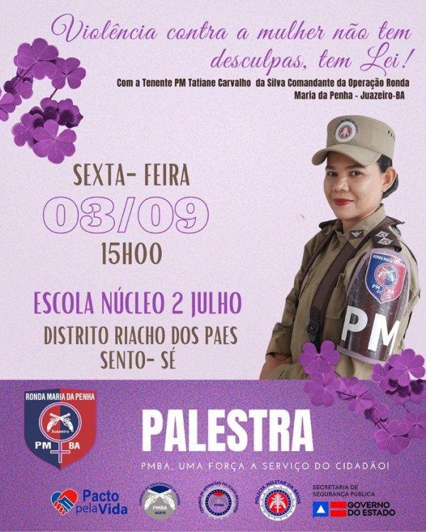 A palestra será proferida pela Tenente PM Tatiane Carvalho da Silva, Comandante da ORMP de Juazeiro, com o tema: Violência contra a mulher não tem desculpas, tem Lei.