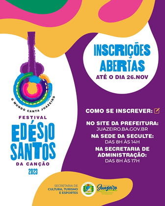 Encerra neste domingo (26) o prazo para que artistas músicos possam fazer a inscrição no Festival Edésio Santos da Canção. O evento é realizado pela Prefeitura de Juazeiro, através da Secretaria de Cultura, Turismo e Esporte (Seculte), e já está em sua 25ª edição fomentando a cultura poética musical dos artistas. O Festival será realizado de 20 a 23 de dezembro.