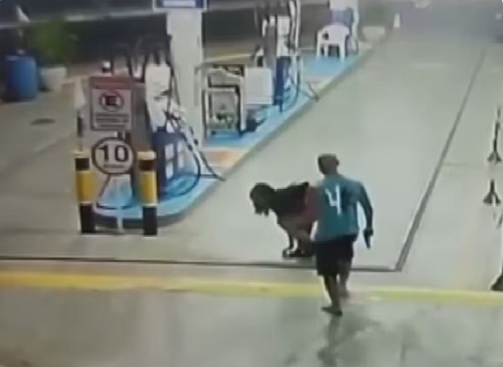 O suspeito consegue imobilizar a vítima e dispara tiros contra ela. Há outras pessoas no posto de combustível observando, mas ninguém impediu as agressões.