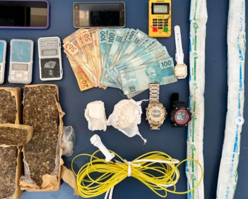 Na ocasião, foram apreendidos 200g de cocaína; 2 quilos e meio de maconha; 02 emulsões explosivas; alguns metros de cordel para acionamento de explosivos; 03 balanças de precisão; 01 maquineta de cartão; R$ 5.350,00 reais em espécie; 01 motocicleta Honda Cg 150, cor azul.