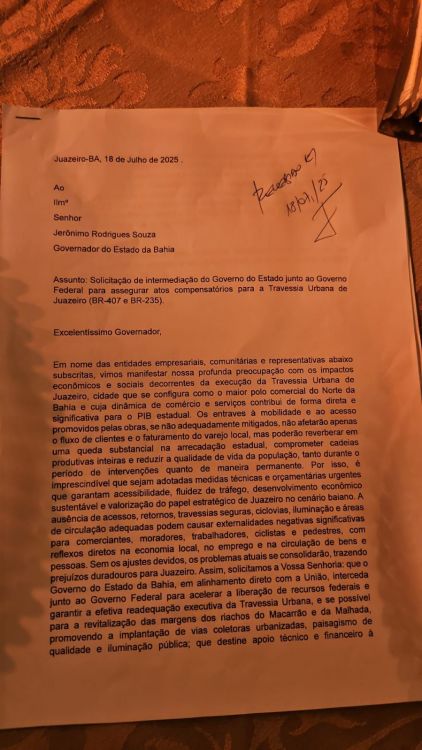 Representantes de entidades empresariais, comunitárias e sindicais de Juazeiro entregaram, na noite da última sexta-feira (18), uma carta ao governador da Bahia, Jerônimo Rodrigues, solicitando apoio urgente para minimizar os impactos negativos das obras da Travessia Urbana, que envolvem trechos da BR-407 e BR-235.