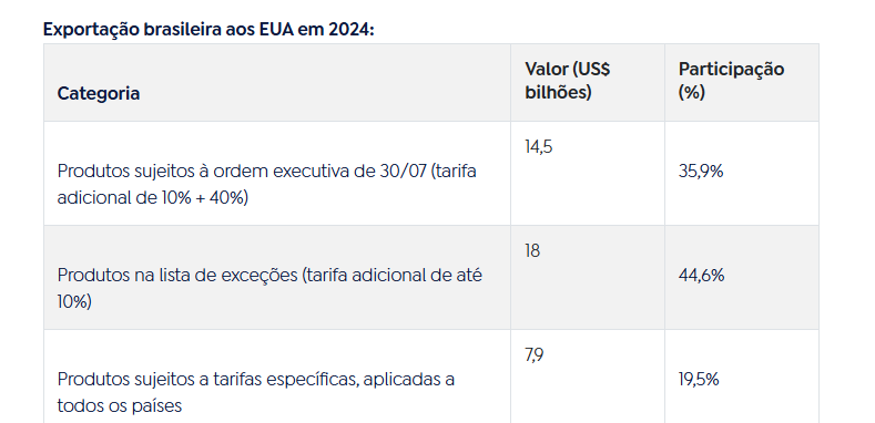 De acordo com o Mdic, 64,1% das exportações brasileiras continuam concorrendo em condições semelhantes com produtos de outros países no mercado estadunidense. Esse percentual é a soma dos 44,6% de vendas excluídas do tarifaço e dos 19,5% de exportações com tarifas específicas.
