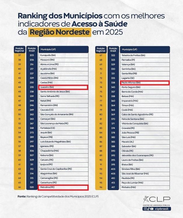 O município de Juazeiro (BA) alcançou posição de destaque no Ranking de Competitividade dos Municípios 2025, divulgado pelo Centro de Liderança Pública (CLP). No pilar Acesso à Saúde, Juazeiro figura na 44ª posição entre os municípios do Nordeste e na 235ª colocação nacional, obtendo a melhor colocação do Vale do São Francisco. Petrolina aparece em 66º lugar regional e 320º no ranking nacional. Entre os municípios que margeiam o Rio São Francisco ainda aparece Paulo Afonso (BA) na 73ª posição regional e 338ª no ranking nacional.