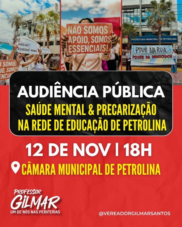 • Petrolina realizará audiência pública para debater saúde mental e assédio moral na Rede Municipal de Educação, por proposição do Professor Gilmar Santos